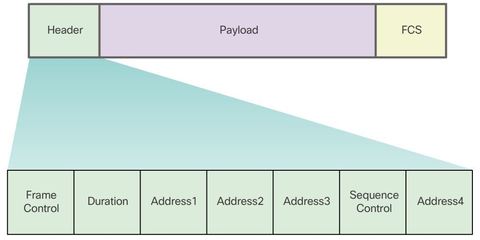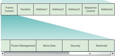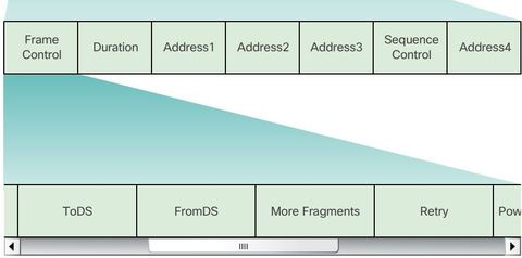 | Wireless 802.11 Frame * Address3 - Sometimes contains the MAC address of the destination, such as the router interface (default gateway) to which the AP is attached. * Sequence Control - Contains the Sequence Number and the Fragment Number subfields. The Sequence Number indicates the sequence number of each frame. The Fragment Number indicates the number of each frame sent of a fragmented frame. * Address4 - Usually missing because it is used only in ad hoc mode. * Payload - Contains the data for transmission. * FCS - Frame Check Sequence; used for Layer 2 error control. | |