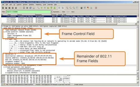 | Wireless 802.11 Frame Ej: displays a Wireshark capture of a WLAN beacon frame. Notice how the Frame Control field has also been expanded to display its subfields. Note: The content of the Address fields vary depending on settings in the Frame Control field. | |
