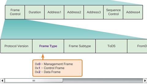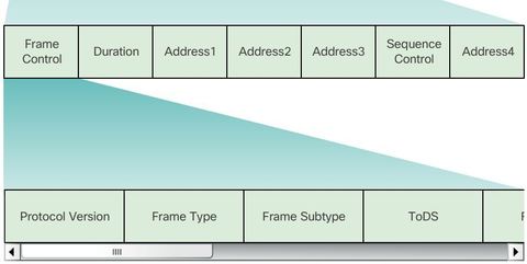 | Frame Control Field 1. Protocol Version - Provides the current version of the 802.11 protocol used. Receiving devices use this value to determine if the version of the protocol of the received frame is supported. 2. & 3. Frame Type and Frame Subtype - Determines the function of the frame. A wireless frame can either be a control frame, data frame, or a management frame. There are multiple subtype fields for each frame type. Each subtype determines the specific function to perform for its associated frame type. | |