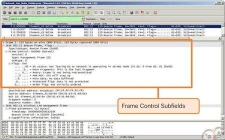 | Frame Control Field Ej: displays a Wireshark capture of a WLAN beacon frame. Notice that the Frame Type field and the Frame Subtype fields identify if the frame is a management frame, a control frame, or a data frame. In the example, the Frame Type is ‘0x0’ identifying it as a management frame. The subtype value ‘8’ identifies this as a beacon frame. The frame is specifically identified as ‘0x08’. | |