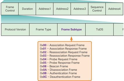 | Management Frames Management frames are used exclusively to find, authenticate, and associate with an AP. 1. Association request frame - (0x00) Sent from a wireless client, it enables the AP to allocate resources and synchronize. The frame carries information about the wireless connection including supported data rates and SSID of the network to the wireless client that wants to associate. If the request is accepted, the AP reserves memory and establishes an association ID for the device. 2. Association response frame - (0x01) Sent from an AP to a wireless client containing the acceptance or rejection to an association request. If it is an acceptance, the frame contains information, such as an association ID and supported data rates. | |