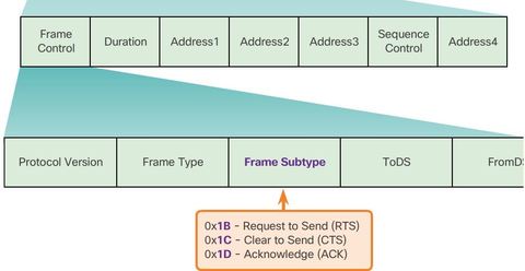 | Control Frames 2. Clear to Send (CTS) frame - A wireless AP responds to an RTS frame with a CTS frame. It provides clearance for the requesting wireless client to send a data frame. The CTS contributes to collision control management by including a time value. This time delay minimizes the chance that other wireless clients will transmit while the requesting client transmits. 3. Acknowledgment (ACK) frame - After receiving a data frame, the receiving wireless client sends an ACK frame to the sending client if no errors are found. If the sending client does not receive an ACK frame within a predetermined period of time, the sending client resends the frame. | |