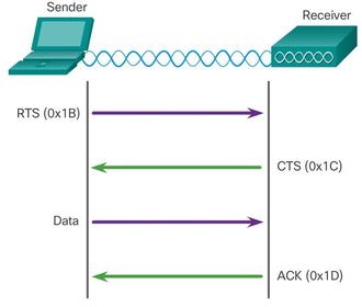 | Control Frames 1. Request to Send (RTS) frame - The RTS and CTS frames provide an optional collision reduction scheme for APs with hidden wireless clients. A wireless client sends an RTS frame as the first step in the two-way handshake, which is required before sending data frames. ** Control frames are integral to wireless transmission and play a significant role in the media contention method used by wireless, known as: Carrier Sense Multiple Access with Collision Avoidance (CSMA/CA). - “acceso múltiple por detección de portadora y prevención de colisiones” | |