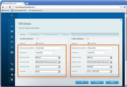 | Association Parameters * SSID: un SSID es un identificador único que usan los clientes inalámbricos para distinguir entre varias redes inalámbricas en la misma área. Según la configuración de la red, varios AP en una red pueden compartir un SSID. ** La configuración Mixed proporciona más flexibilidad, pero también puede lentificar la comunicación. Por ejemplo, si todos los clientes inalámbricos que se conectan al router usan 802.11n, todos disfrutan de las mejores velocidades de datos que se proporcionan. Si un cliente inalámbrico 802.11g se asocia al AP, todos los clientes inalámbricos más rápidos que compiten por el canal deben esperar a que los clientes 802.11g despejen el canal antes de transmitir Los Linksys EA6500 no admite 802.11ad. | |