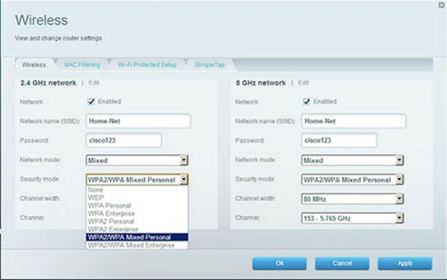 | Association Parameters Las opciones de Security que se indican en la figura 4 son opciones de protocolos de seguridad disponibles en el router inalámbrico Linksys EA6500. ** Los usuarios domésticos deben elegir WPA2/WPA Mixed Personal (WPA2/WPA personal combinado), mientras que los usuarios empresariales normalmente eligen WPA2/WPA Mixed Enterprise (WPA2/WPA empresarial combinado). | |