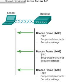 | Discovering Aps 1. Passive mode - The AP openly advertises its service by periodically sending broadcast beacon frames containing the SSID, supported standards, and security settings. The primary purpose of the beacon is to allow wireless clients to learn which networks and APs are available in a given area, thereby allowing them to choose which network and AP to use. | |