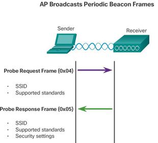 | Discovering Aps 2. Active mode - Wireless clients must know the name of the SSID. The wireless client initiates the process by broadcasting a probe request frame on multiple channels. The probe request includes the SSID name and standards supported. Active mode may be required if an AP or wireless router is configured to not broadcast beacon frames. ** A wireless client could also send a probe request without an SSID name to discover nearby WLAN networks. APs configured to broadcast beacon frames would respond to the wireless client with a probe response and provide the SSID name. APs with the broadcast SSID feature disabled do not respond. | |