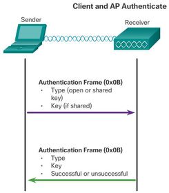| Authentication ** In most shared key authentication installations, the exchange is as follows: 1. The wireless client sends an authentication frame to the AP. 2. The AP responds with a challenge text to the client. | 3. The client encrypts the message using its shared key and returns the encrypted text back to the AP. 4. The AP then decrypts the encrypted text using its shared key. 5. If the decrypted text matches the challenge text, the AP authenticates the client. If the messages do not match, the wireless client is not authenticated and wireless access is denied. |