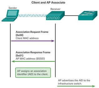 | Authentication After a wireless client has been authenticated, the AP proceeds to the association stage. 1. The wireless client forwards an Association Request frame that includes its MAC address. 2. The AP responds with an Associate Response that includes the AP BSSID, which is the AP MAC address. ** 3. The AP maps a logical port known as the association identifier (AID) to the wireless client. The AID is equivalent to a port on a switch and allows the infrastructure switch to keep track of frames destined for the wireless client to be forwarded. | |