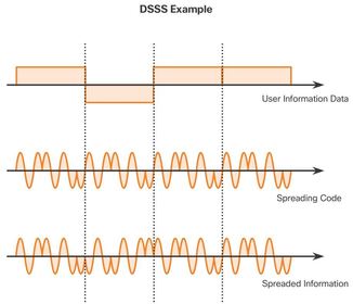| Frequency Channel Saturation * Direct-sequence spread spectrum (DSSS) - DSSS is a spread-spectrum modulation technique. Spread-spectrum is designed to spread a signal over a larger frequency band making it more resistant to interference. With DSSS the signal is multiplied by a “crafted noise” known as a spreading code. Because the receiver knows about the spreading code and when it was added, it can mathematically remove it and re-construct the original signal. In effect, this creates redundancy in the transmitted signal in an effort to counter quality loss in the wireless medium. ** DSSS is used by 802.11b. Also used by cordless phones operating in the 900 MHz, 2.4 GHz, 5.8 GHz bands, CDMA cellular, and GPS networks. | |