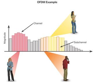 | Frequency Channel Saturation * Orthogonal frequency-division multiplexing (OFDM) - OFDM is a subset of frequency division multiplexing in which a single channel utilizes multiple sub-channels on adjacent frequencies. Sub-channels in an OFDM system are precisely orthogonal to one another which allow the sub-channels to overlap without interfering. As a result, OFDM systems are able to maximize spectral efficiency without causing adjacent channel interference. In effect, this makes it easier for a receiving station to “hear” the signal. Because OFDM uses sub-channels, channel usage is very efficient. ** OFDM is used by a number of communication systems including 802.11a/g/n/ac. | |
