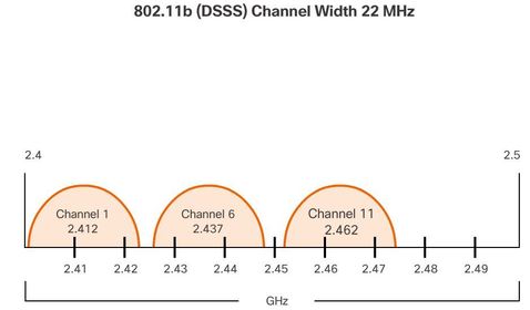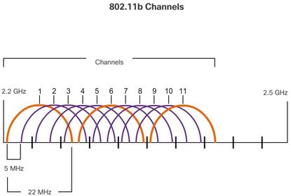 | Selecting Channels Interference occurs when an undesired signal overlaps a channel reserved for a desired signal, causing possible distortion. ** The solution to interference is to use non-overlapping channels. Specifically, channels 1, 6, and 11 are non-overlapping 802.11b channels, A best practice for WLANs requiring multiple APs is to use non-overlapping channels. If there are three adjacent APs, use channels 1, 6, and 11. If there are just two, select any two that are five channels apart, such as channels 5 and 10. Most APs can automatically select a channel based on adjacent channels used. Some products continuously monitor the radio space to adjust the channel settings dynamically in response to environmental changes. | |