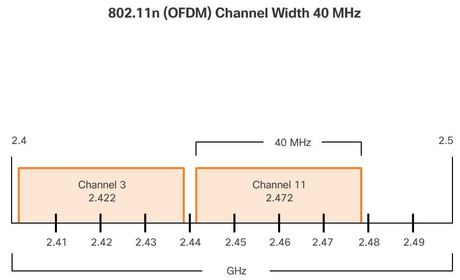 | Selecting Channels ** 802.11n can also use channel bonding, which combines two 20 MHz channel into one 40 MHz channel, Channel bonding increase throughput by using two channels at one time to deliver data. Most modern APs can auto-adjust channels to circumvent interference. * Note: IEEE 802.11ac uses OFDM with channels widths of 80, 160, and 80+80. | |