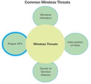 | Securing Wireless * Rouge Aps - Unauthorized APs installed by a well-intentioned user or willingly for malicious. Note: Other threats, such as AP/wireless client MAC spoofing, cracking, and infrastructure attacks are outside the scope of this chapter. | |