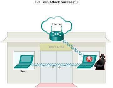 | Man-in-the-Middle Attack A popular wireless MITM attack is called the “evil twin AP” attack, where an attacker introduces a rogue AP and configures it with the same SSID as a legitimate AP. Connecting wireless clients would see two APs offering wireless access. Those near the rogue AP find the stronger signal and most likely associate with the evil twin AP. User traffic is now sent to the rogue AP, which in turn captures the data and forwards it to the legitimate AP. Return traffic from the legitimate AP is sent to the rogue AP, captured, and then forwarded to the unsuspecting STA. | |
