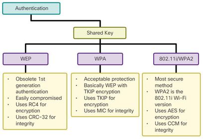 | Shared Key Authentication Methods * Wired Equivalent Privacy (WEP) - Original 802.11 specification designed to provide privacy similar to connecting to a network using a wired connection. The data is secured using the RC4 encryption method with a static key. However, the key never changes when exchanging packets making it easy to hack. * Wi-Fi Protected Access (WPA) - A Wi-Fi Alliance standard that uses WEP, but secures the data with the much stronger Temporal Key Integrity Protocol (TKIP) encryption algorithm. TKIP changes the key for each packet making it much more difficult to hack. | |