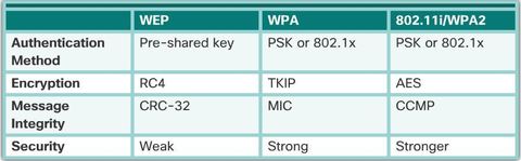 | Encryption Methods ** Temporal Key Integrity Protocol (TKIP) - TKIP is the encryption method used by WPA. It provides support for legacy WLAN equipment by addressing the original flaws associated with the 802.11 WEP encryption method. It makes use of WEP, but encrypts the Layer 2 payload using TKIP, and carries out a Message Integrity Check (MIC) in the encrypted packet to ensure the message has not been tampered with. | * Advanced Encryption Standard (AES) - AES is the encryption method used by WPA2. It is the preferred method because it aligns with the industry standard IEEE 802.11i. AES performs the same functions as TKIP, but it is a far stronger method of encryption. It uses the: -- Counter Cipher Mode with Block Chaining Message Authentication Code Protocol (CCMP) that allows destination hosts to recognize if the encrypted and non-encrypted bits have been tampered with. ** Note: Always choose WPA2 with AES when possible. |