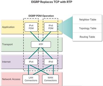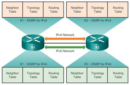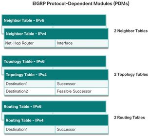 | Protocol Dependent Modules PDMs are responsible for the specific routing tasks for each network layer protocol, including: * Maintaining the neighbor and topology tables of EIGRP routers that belong to that protocol suite * Building and translating protocol-specific packets for DUAL * Interfacing DUAL to the protocol-specific routing table | * Computing the metric and passing this information to DUAL * Implementing filtering and access lists * Performing redistribution functions to and from other routing protocols * Redistributing routes that are learned by other routing protocols |