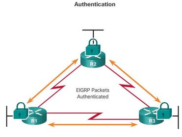 | Authentication It is a good practice to authenticate transmitted routing information. Doing so ensures that routers only accept routing information from other routers that have been configured with the same password or authentication information. ** Note: Authentication does not encrypt the EIGRP routing updates. | |