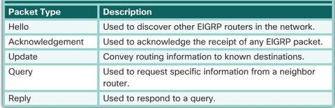 | EIGRP Packet Types EIGRP uses five different packet types, some in pairs. EIGRP packets are sent using either RTP reliable or unreliable delivery and can be sent as a unicast, multicast, or sometimes both. EIGRP packet types are also called EIGRP packet formats or EIGRP messages. | |
