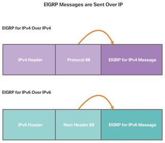 | EIGRP Packet Types Ej: shows that EIGRP messages are typically encapsulated in IPv4 or IPv6 packets. * EIGRP for IPv4 messages use IPv4 as the network layer protocol. The IPv4 protocol field uses 88 to indicate the data portion of the packet is an EIGRP for IPv4 message. EIGRP for IPv6 messages are encapsulated in IPv6 packets using the next header field of 88. Similar, to the protocol field for IPv4, the IPv6 next header field indicates the type of data carried in the IPv6 packet. | |