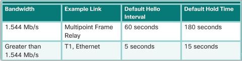 | EIGRP Hello Packets On most networks, EIGRP Hello packets are sent as multicast packets every five seconds. ** However, on multipoint, nonbroadcast multiple access (NBMA) networks, such as X.25, Frame Relay, and Asynchronous Transfer Mode (ATM) interfaces with access links of T1 (1.544 Mb/s) or slower, Hello packets are sent as unicast packets every 60 seconds. | EIGRP uses a Hold timer to determine the maximum time the router should wait to receive the next Hello before declaring that neighbor as unreachable. ** By default, the hold time is three times the Hello interval, or 15 seconds on most networks and 180 seconds on low-speed NBMA networks. If the hold time expires, EIGRP declares the route as down and DUAL searches for a new path by sending out queries. |