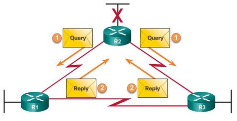 | EIGRP Query and Reply Packets 4. EIGRP Query Packets DUAL uses query and reply packets when searching for networks and other tasks Ej: R2 has lost connectivity to the LAN and it sends out queries to all EIGRP neighbors searching for any possible routes to the LAN. Because queries use reliable delivery, the receiving router must return an EIGRP acknowledgment. To keep this example simple, acknowledgments were omitted in the graphic. 5. EIGRP Reply Packets All neighbors must send a reply, regardless of whether or not they have a route to the downed network. | |
