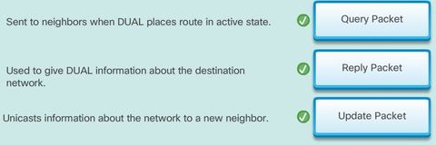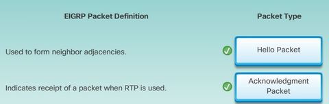| EIGRP Update Packets ** EIGRP sends incremental updates only when the state of a destination changes. This may include when a new network becomes available, an existing network becomes unavailable, or a change occurs in the routing metric for an existing network. ** EIGRP uses the terms partial and bounded when referring to its updates. The term partial means that the update only includes information about the route changes. The term bounded refers to the propagation of partial updates that are sent only to those routers that the changes affect. | EIGRP Acknowledgment Packets EIGRP sends Acknowledgment (ACK) packets when reliable delivery is used. An EIGRP acknowledgment is an EIGRP Hello packet without any data. RTP uses reliable delivery for EIGRP update, query, and reply packets. EIGRP acknowledgment packets are always sent as an unreliable unicast. Unreliable delivery makes sense; otherwise, there would be an endless loop of acknowledgments. Note: Some documentation refers to the Hello and acknowledgment as a single type of EIGRP packet |