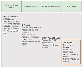 | Encapsulating EIGRP Messages This data field is called type, length, value (TLV). The types of TLVs relevant to this course are EIGRP parameters, IP internal routes, and IP external routes. ** The EIGRP packet header and TLV are then encapsulated in an IPv4 packet. In the IPv4 packet header, the protocol field is set to 88 to indicate EIGRP, and the IPv4 destination address is set to the multicast 224.0.0.10. If the EIGRP packet is encapsulated in an Ethernet frame, the destination MAC address is also a multicast address, 01-00-5E-00-00-0A. | |