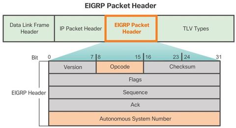 | EIGRP Packet Header and TLV * Opcode: EIGRP Packet Type: Update (1), Query (3), Reply (4), Hello (5) * Autonomous System Number: specifies the EIGRP routing process. Unlike RIP, multiple instances of EIGRP can run on a network; the autonomous system number is used to track each running EIGRP process. | |