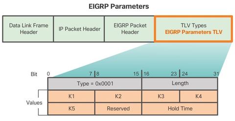 | EIGRP Packet Header and TLV * The EIGRP parameter’s message includes the weights that EIGRP uses for its composite metric. By default, only bandwidth and delay are weighted. Both are weighted equally; therefore, the K1 field for bandwidth and the K3 field for delay are both set to one (1). The other K values are set to zero (0). * The Hold Time is the amount of time the EIGRP neighbor receiving this message should wait before considering the advertising router to be down. | |