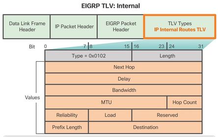 | EIGRP Packet Header and TLV * The Destination field: stores the address of the destination network. Although only 24 bits are shown in this figure, this field varies based on the value of the network portion of the 32-bit network address. For example, the network portion of 10.1.0.0/16 is 10.1; therefore, the Destination field stores the first 16 bits. Because the minimum length of this field is 24 bits, the remainder of the field is padded with zeros. If a network address is longer than 24 bits (192.168.1.32/27, for example), then the Destination field is extended for another 32 bits (for a total of 56 bits) and the unused bits are padded with zeros. | |