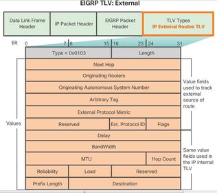 | EIGRP Packet Header and TLV The IP external message is used when external routes are imported into the EIGRP routing process. In this chapter, we will import or redistribute a default static route into EIGRP. Notice that the bottom half of the IP External Routes TLV includes all the fields used by the IP Internal TLV. ** Note: The maximum transmission unit (MTU) is not a metric used by EIGRP. The MTU is included in the routing updates, but it is not used to determine the routing metric. | |