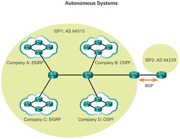 | Autonomous System Numbers EIGRP uses the "router eigrp (autonomous-system)" command to enable the EIGRP process. The autonomous system number referred to in the EIGRP configuration is not associated with the Internet Assigned Numbers Authority (IANA) globally assigned autonomous system numbers used by external routing protocols An IANA globally assigned autonomous system is a collection of networks under the administrative control of a single entity that presents a common routing policy to the Internet. In the figure, companies A, B, C, and D are all under the administrative control of ISP1. ISP1 presents a common routing policy for all of these companies when advertising routes to ISP2. | |