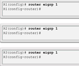 | The Router EIGRP Command Ej: ? command does not start the EIGRP process itself. The router does not start sending updates. Rather, this command only provides access to configure the EIGRP settings. To completely remove the EIGRP routing process from a device, use the no router eigrp autonomous-system global configuration mode command, which stops the EIGRP process and removes all existing EIGRP router configurations. | |