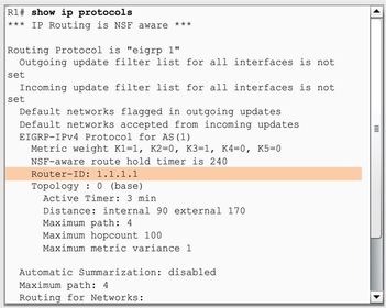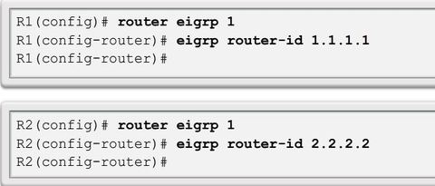 | Determining the Router ID Cisco routers derive the router ID based on three criteria, in the following precedence: 1. Use the IPv4 address configured with the eigrp router-id router configuration mode command. 2. If the router ID is not configured, the router chooses the highest IPv4 address of any of its loopback interfaces. 3. If no loopback interfaces are configured, the router chooses the highest active IPv4 address of any of its physical interfaces. | If the network administrator does not explicitly configure a router ID using the eigrp router-id command, EIGRP generates its own router ID using either a loopback or physical IPv4 address. ** A loopback address is a virtual interface and is automatically in the up state when configured. The interface does not need to be enabled for EIGRP, meaning that it does not need to be included in one of the EIGRP network commands. However, the interface must be in the up/up state. |
