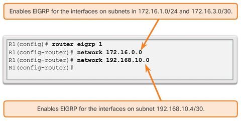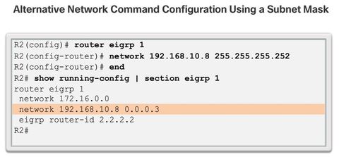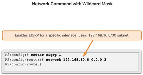 | The Network Command and Wildcard Mask By default, when using the network command and an IPv4 network address, such as 172.16.0.0, all interfaces on the router that belong to that classful network address are enabled for EIGRP. However, there may be times when the network administrator does not want to include all interfaces within a network when enabling EIGRP. | To configure EIGRP to advertise specific subnets only, use the wildcard-mask option with the network command: Router(config-router)# network (network-address) [wildcard-mask] |