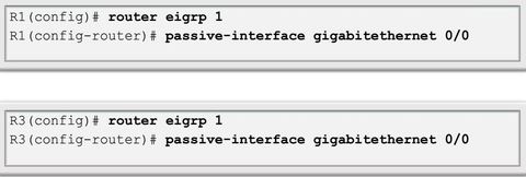 | Passive Interface There are two primary reasons for enabling the passive-interface command: 1. To suppress unnecessary update traffic, such as when an interface is a LAN interface, with no other routers connected 2. To increase security controls, such as preventing unknown rogue routing devices from receiving EIGRP updates * Router(config)# router eigrp (as-number) * Router(config-router)# passive-interface (interface-type) (interface-number) Note: To configure all interfaces as passive, use the "passive-interface default" command. To disable an interface as passive, use the "no passive-interface interface-type interface-number" command. | |