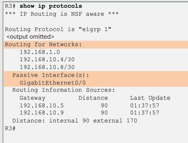 | Passive Interface An example of using the passive interface to increase security controls is when a network must connect to a third-party organization, for which the local administrator has no control, such as when connecting to an ISP network. In this case, the local network administrator would need to advertise the interface link through their own network, but would not want the third-party organization to receive or send routing updates to the local routing device, as this is a security risk. * Ej: ? To verify whether any interface on a router is configured as passive | |