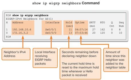 | Verifying EIGRP: Examining Neighbors "show ip eigrp neighbors" command is very useful for verifying and troubleshooting EIGRP. If a neighbor is not listed after adjacencies have been established with a router’s neighbors, check the local interface to ensure it is activated with the show ip interface brief command. If the interface is active, try pinging the IPv4 address of the neighbor. If the ping fails, it means that the neighbor interface is down and must be activated. | If the ping is successful and EIGRP still does not see the router as a neighbor, examine the following configurations: * Are both routers configured with the same EIGRP autonomous system number? * Is the directly connected network included in the EIGRP network statements? |