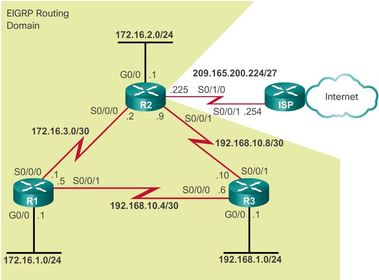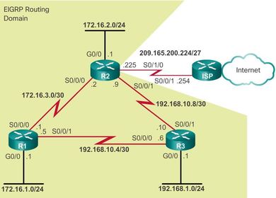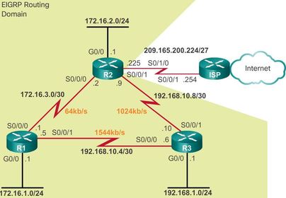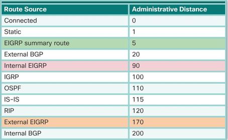 | EIGRP Topology Table EIGRP updates contain networks that are reachable from the router sending the update. As EIGRP updates are exchanged between neighbors, the receiving router adds these entries to its EIGRP topology table. Each EIGRP router maintains a topology table for each routed protocol configured, such as IPv4 and IPv6. The topology table includes route entries for every destination that the router learns from its directly connected EIGRP neighbor | |