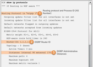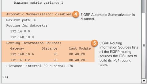 | 4. By default, EIGRP does not automatically summarize networks. Subnets are included in the routing updates. ** Note: Prior to IOS 15, EIGRP automatic summarization was enabled by default. ** The output from the show ip protocols command is useful in debugging routing operations. Information in the Routing Information Sources field can help identify a router suspected of delivering bad routing information. The Routing Information Sources field lists all the EIGRP routing sources the Cisco IOS software uses to build its IPv4 routing table. | |