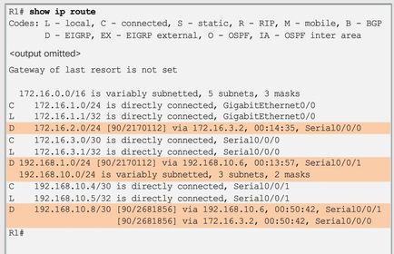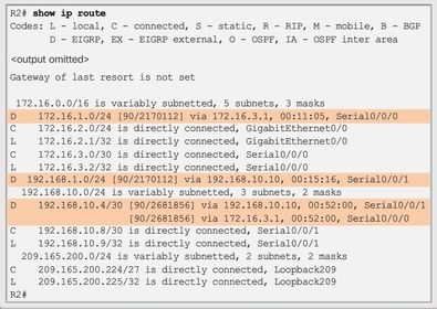 | Verifying EIGRP: Examine the IPv4 routing table Router(config-router)# no auto-summary (For older 15. Versions ) The letter D was used to represent EIGRP because the protocol is based upon the DUAL algorithm. Ej: R1 has two paths to the 192.168.10.8/30 network, because its cost or metric to reach that network is the same or equal using both routers. These are known as equal cost routes. R1 uses both paths to reach this network, which is known as load balancing. | |