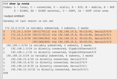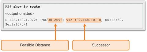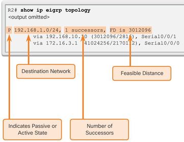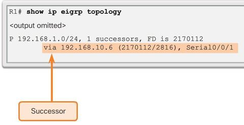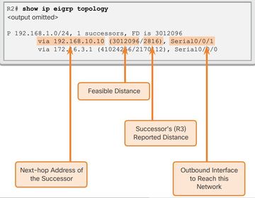 | Ej: ? the topology table displays: the first subentry in the output shows the successor: * via 192.168.10.10 - Next-hop address of the successor, R3. This address is shown in the routing table. * 3012096 - FD to 192.168.1.0/24. It is the metric shown in the IP routing table. * 2816 - RD of the successor and is R3’s cost to reach this network. | |
