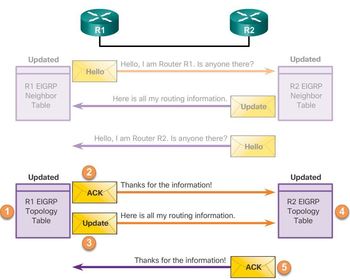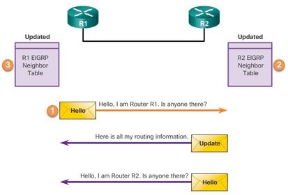 | EIGRP Neighbor Adjacency 1. A new router (R1) comes up on the link and sends an EIGRP Hello packet through all of its EIGRP-configured interfaces. 2. Router R2 receives the Hello packet on an EIGRP-enabled interface. R2 replies with an EIGRP update packet that contains all the routes it has in its routing table, except those learned through that interface (split horizon). However, the neighbor adjacency is not established until R2 also sends an EIGRP Hello packet to R1. 3. After both routers have exchanged Hellos, the neighbor adjacency is established. R1 and R2 update their EIGRP neighbor tables adding the adjacent router as a neighbor. | |