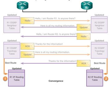 | EIGRP Convergence 1. After receiving the EIGRP update packets from R2, using the information in the topology table, R1 updates its IP routing table with the best path to each destination, including the metric and the next-hop router. 2. Similar to R1, R2 updates its IP routing table with the best path routes to each network. At this point, EIGRP on both routers is considered to be in the converged state. | |