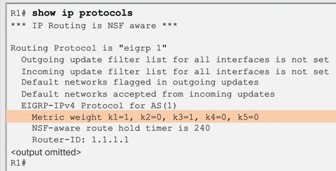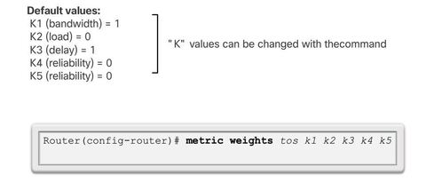 | EIGRP Composite Metric Ej: ? command is used to verify the k values. ** The metric calculation method (k values) and the EIGRP autonomous system number must match between EIGRP neighbors. If they do not match, the routers do not form an adjacency. Router(config-router)# metric weights (tos k1 k2 k3 k4 k5) If one router has modified the metric weights and another router has not, an adjacency does not form. | |