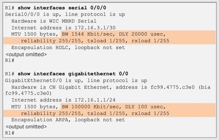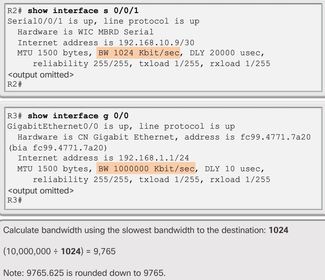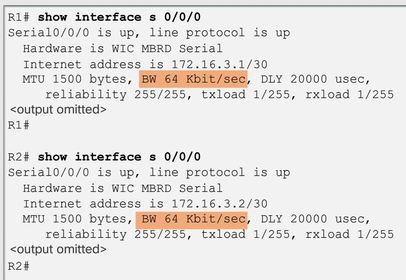 | Bandwidth Metric The bandwidth metric is a static value used by some routing protocols, such as EIGRP and OSPF, to calculate their routing metric. The bandwidth is displayed in kilobits per second (kb/s). ** Most serial interfaces use the default bandwidth value of 1544 kb/s or 1,544,000 b/s (1.544 Mb/s). This is the bandwidth of a T1 connection. However, some serial interfaces use a different default bandwidth value | |