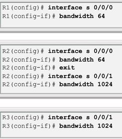 | Bandwidth Metric Ej: ? command to verify the new bandwidth parameters It is important to modify the bandwidth metric on both sides of the link to ensure proper routing in both directions. Modifying the bandwidth value does not change the actual bandwidth of the link. The bandwidth command only modifies the bandwidth metric used by routing protocols, such as EIGRP and OSPF | |