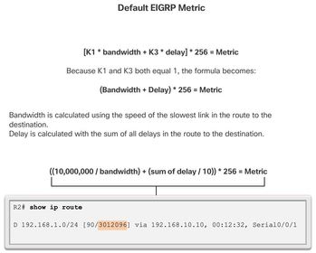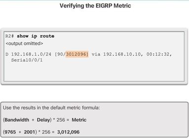 | How to Calculate the EIGRP Metric Step 1. Determine the link with the slowest bandwidth. Use that value to calculate bandwidth (10,000,000/bandwidth). Step 2. Determine the delay value for each outgoing interface on the way to the destination. Add the delay values and divide by 10 (sum of delay/10). Step 3. This composite metric produces a 24-bit value; however, EIGRP uses a 32-bit value. Multiplying the 24-bit value with 256 extends the composite metric into 32 bits. Therefore, add the computed values for bandwidth and delay, and multiply the sum by 256 to obtain the EIGRP metric. | |